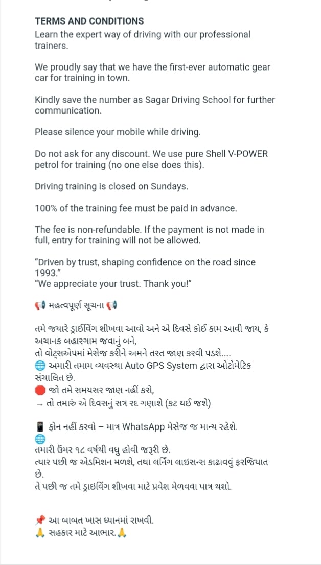 Driving education is one of the most important and long-lasting educations that everyone can invest in in their life. At SAGAR Driving School we value integrity, safety and results. This means we make sure you get the best value from your investment in high quality driving lessons in Town Indeed due to this approach we were able to achieve the title of one of the best driving schools in JAMNAGAR
